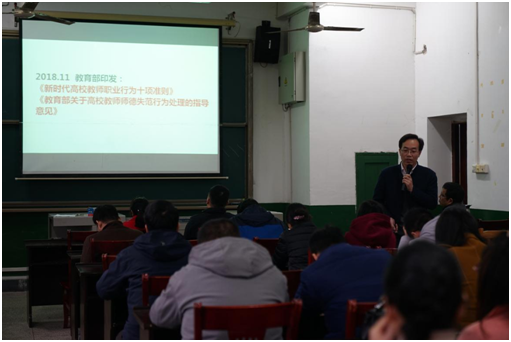 胡义伟以习近平总书记关于传道者首先要明道信道为开篇,对师德师风建设的意义、内涵、重点和注意事项进行阐释,组织学习《新时代高校教师职业行为十项准则》《关于加强和改进新时代师德师风建设的意见》《研究生导师指导行为准则》等文件精神,并结合师德失范典型案例等进行警示教育。他强调,全院教师要把教书育人和自我修养结合起来,做到以德立身、以德立学、以德施教,做新时代“四有”好老师。
