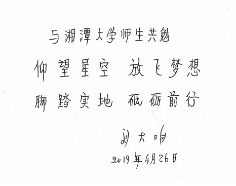王功昊、周芊骞分别从飞机发动机对不同材料的需求程度及航空航天降低成本的可行途径两方面提出疑惑,刘院士就他们所提的问题作出了详细解答。最后,刘院士题词“仰望星空,放飞梦想,脚踏实地,砥砺前行”与我校师生共勉。