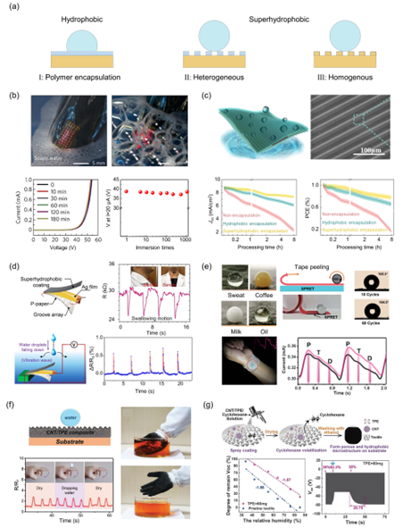有效防止外界的水分进入设备内部导致其性能退化或短路,是高性能可穿戴健康和能源设备所要解决的问题之一。超疏水表面的粗糙结构能够在水和器件之间形成空气层,从而降低液滴和器件之间的接触。相比于传统的聚合物封装策略,器件采用超疏水封装层或者自身具有超疏水特性更使得其有效地抵抗外界的水分渗透。