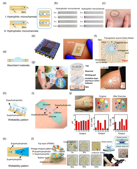 可穿戴中汗液分析的准确性依赖于液样的高效收集,污染和蒸发量的最小化。作者总结了通过具有亲/疏水特征的微流通道、亲水多孔介质以及润湿性图案化表面实现汗液定量收集的多种策略。亲水微流通道中汗液在毛细作用的驱动下自发流动,而疏水通道中的汗液流动需要依赖体表汗液蒸发压的驱动。因此,基于亲水通道设计的微流控芯片需要稳定可靠的亲水改性方法,而基于疏水通道的微流控芯片则需要更强的粘附材料。亲水多孔介质材料(包括海绵,织物,纸等)得益于毛细作用即可自发吸入汗液,为低成本汗液采集提供了可行的方案。由于超亲水表面的毛细吸附作用和超疏水表面的排斥作用,结合两者优点的润湿性图案化设计则成为另一种可直接延时收集并即时检测汗液的新手段。此外,将不对称分布的润湿性图案化设计引入微通道中,也显示出相比于亲水通道更高的汗液传输效率。