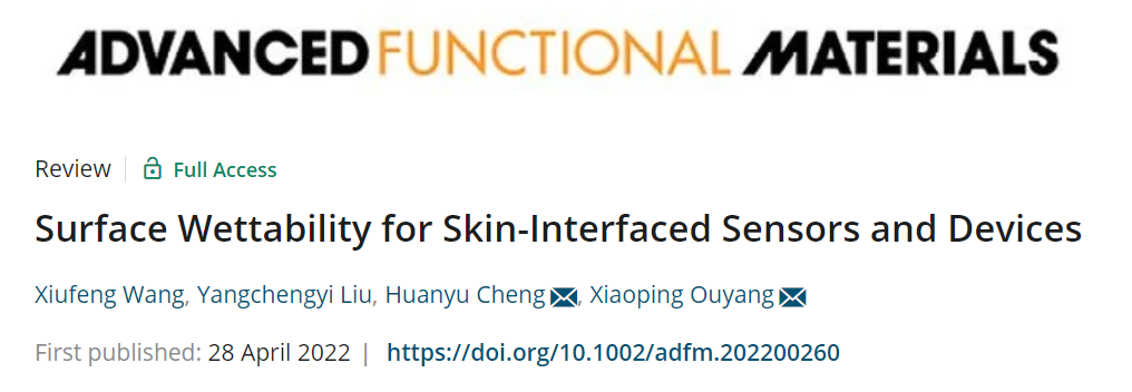 2022年4月,王秀锋教授课题组以“表面润湿性在皮肤贴合类器件中的应用(Surface Wettability for Skin-Interfaced Sensors and Devices)”为题在材料领域国际著名期刊《先进功能材料》(Advanced Functional Materials, IF: 18.808)发表综述长文。王秀锋教授为第一作者,其博士生刘杨承毅为第二作者,欧阳晓平院士和宾州州立大学程寰宇教授为通讯作者,湘潭大学为论文第一单位。该文综述了表面润湿性在可穿戴能源和健康监测器件中的最新进展,包括皮肤贴合类器件中表面润湿性的调控策略(单超亲水、单超疏水、双效图案化和Janus结构等)和前沿应用(自清洁、水分管理、液滴发电、汗液可控收集与即时检测等),分析了可穿戴器件在水合环境中使用可能出现的挑战,展望了表面润湿性在健康监测和能源收集方面的潜在优势和未来机遇。