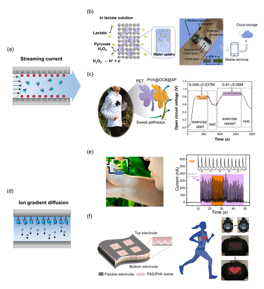 为了从汗液或者周围环境中获取能量用于可穿戴设备的供能,利用蒸发引起的水流在多孔碳微纳米通道中流动时,将热能转化为电能的水伏发电机是近年来新兴的能源收集方式。而亲水处理进一步促进了液体在微纳米通道中的流动,从而增强水伏发电机的输出性能。此外,基于表面润湿性梯度设计的湿度纳米发电机也可以用来从外界湿度环境中收集能量。