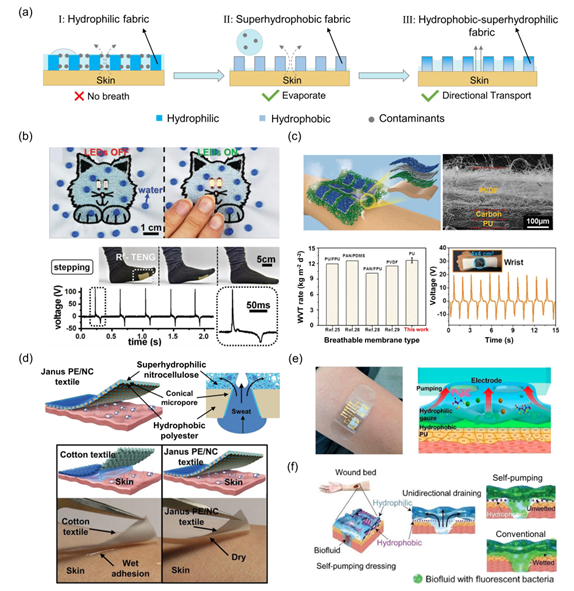 具有高效水分管理的可穿戴器件,不仅可以避免汗液长期积累在皮肤和器件界面处,以增强粘附和降低局部炎症和感染的风险,还能防止外界液体接触、污染或损伤皮肤。相比于传统的亲水多孔介质,超疏水织物具有防水和自清洁特性,能有效避免外界水分和污染物堵塞孔隙,从而保证了稳定的透气性。然而,单一的透气性往往无法承受高强度运动下的大量汗液,基于润湿性梯度设计的Janus织物具有更高效地定向汗液输送能力,故能解决人体大量出汗问题。此外,Janus织物也能应用于伤口管理,避免组织渗出液的聚集,加快体表伤口愈合。