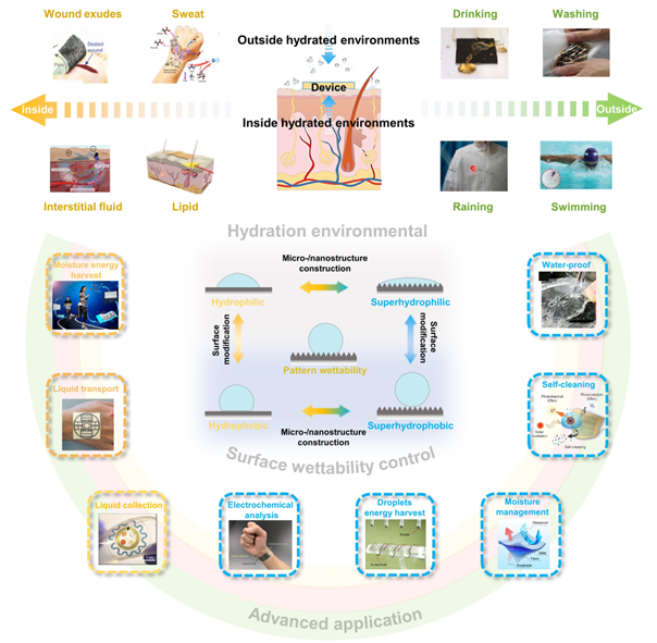 图1 特殊润湿性表面为复杂水合环境中的可穿戴器件带来了新功能和先进应用