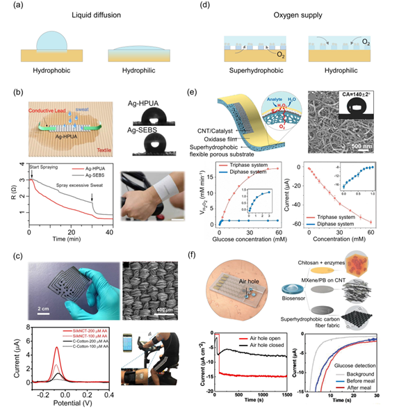 可穿戴电化学分析常用于汗液的分析,其效率高低依赖于电极与汗液间的相互作用,因此表面润湿性也高效电化学分析中发挥重要作用。一方面,具有亲水性特性的电极表面可以加快电解质的扩散,增加电解质与电极的接触面积。另一方面,具有超疏水特性的电极表面能为耗氧酶的反应持续供氧,保证酶的活性,从而保证汗液分析的长时间可靠。