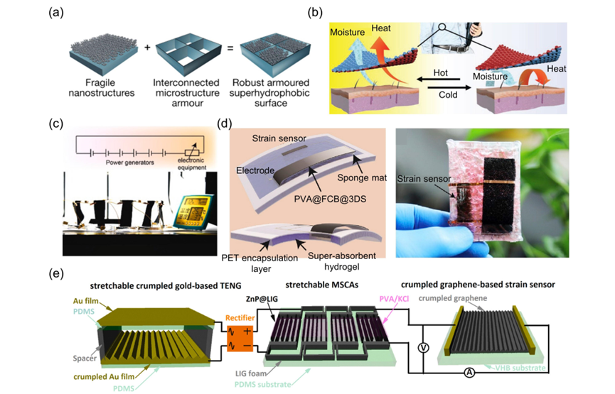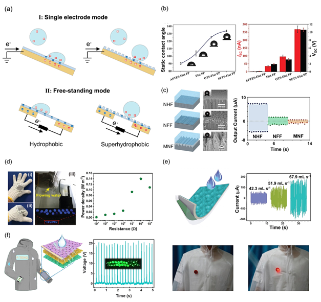 基于液滴能量收集的纳米发电机为可穿戴设备提供了一种低成本且高效的能源解决方案,超疏水表面的应用有效避免了表面液体残留而导致的电输出急剧下降,同时增加的表面粗糙度也可以促进电子转移和水接触分离过程以增强带电性。