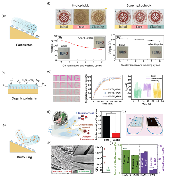 除了液滴外,外界污染物(如微生物、细菌和微颗粒)也会影响器件的性能。具有低粘附力和强斥水性的超疏水表面能利用液滴自发滚动的特性去除表面的污染物,从而实现自清洁。而对于难以被水清除的有机污染物,常采用超亲水的光催化材料对于其进行分解,从而达到去除的目的。此外,大分子和微生物在器件表面自发积累造成的生物污染,也会导致其性能退化和增加人体安全风险(如炎症和病毒感染等),特别是在CoV-2019大流行的当下,会让病毒更易传播。具有自清洁特性的表面则能大大减少带有细菌或病毒的液滴在器件上的停留机会,从而更好地保护用户的安全。