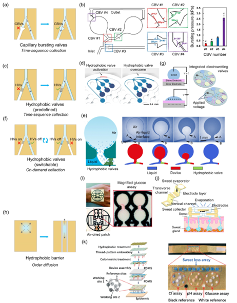 汗液中含有丰富的人体代谢物和生物标志物,为无创检测人体健康状态(例如糖尿病、囊性纤维化和脱水)提供了新的机遇,高效地汗液传输机制使得在单一器件中实现多种汗液组分的连续监测成为可能。在疏水的微流通道中往往采用基于微流通道几何形状变化的毛细爆破阀,而在亲水的微流通道中设置基于润湿性变化的疏水阀也能实现类似功能。此外,通过在亲水介质中构筑疏水壁垒还能实现汗液定向流动,从而规划出多种检测功能的区域。