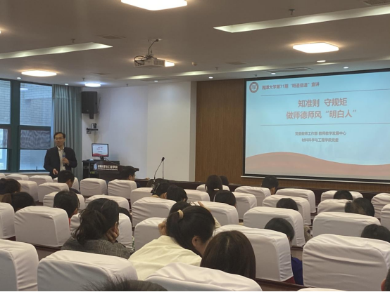 本次讲座主题为“知准则、守规矩,做师德师风‘明白人’”。胡书记从新时代好老师的标准、师德师风是第一标准两个方面着手,强调教育工作和师德师风的重要性,阐述党和人民满意的好教师要具有“四有”、“四个引路人”和“四个相统一”的标准。他强调,师德师风是评价教师队伍素质的第一标准,“十项准则”和“七条红线”是全体教职工必须要遵守的准则和不能逾越的红线。最后胡书记以部分师德失范典型为警示案例,引导广大教师务必引以为戒, 他指出这些高校师德失范案件距离我们并不遥远,希望全体教职工要准确把握人民教师的根本要求,争做“有理想信念、有道德情操、有扎实学识、有仁爱之心”的好老师,做到“经师”与“人师”相统一,做好学生的人生引路人。