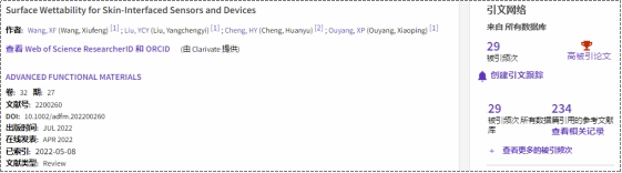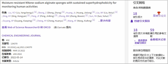 根据美国基本科学指标(Essential Science Indicator, ESI)2023年3月公布的最新数据显示,以yl23455永利官网为第一单位,欧阳晓平院士和王秀锋教授、宾州州立大学陈寰宇教授分别为通讯作者,2022年5月于《Advanced Functional Materials》(IF=19.924,中科院1区Top期刊)发表的综述论文“Surface Wettability for Skin-Interfaced Sensors and Devices”,以及2022年3月于《Chemical Engineering Journal》(IF=16.744, 中科院1区期刊)发表的研究论文“Moisture-resistant MXene-sodium alginate sponges with sustained superhydrophobicity for monitoring human activities”均入选为ESI全球前1%高被引论文。特别是,上述工作最近还被全球142位顶尖学者联合撰写的关于“柔性传感器的技术路线图”的权威论著(Technology Roadmap for flexible sensors,ACS nano,2023,doi: 10.1021/acsnano.2c12606)正面引用。