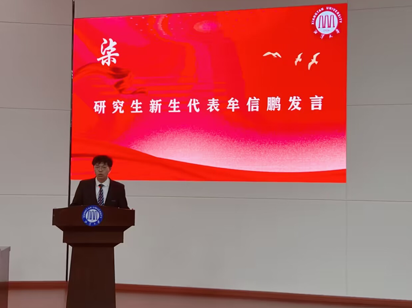 牟信鹏作为研究生新生代表发表入学感言,研究生既是学生,也是科研人员,需要在学习和研究的相辅相成中,实现从知识学习到知识创造的转变,做到实事求是,在学术园地中勤奋耕耘,以聪明才智贡献国家、以初心使命服务社会、以开拓进取成为有理想、有本领、有担当的新时代新青年。