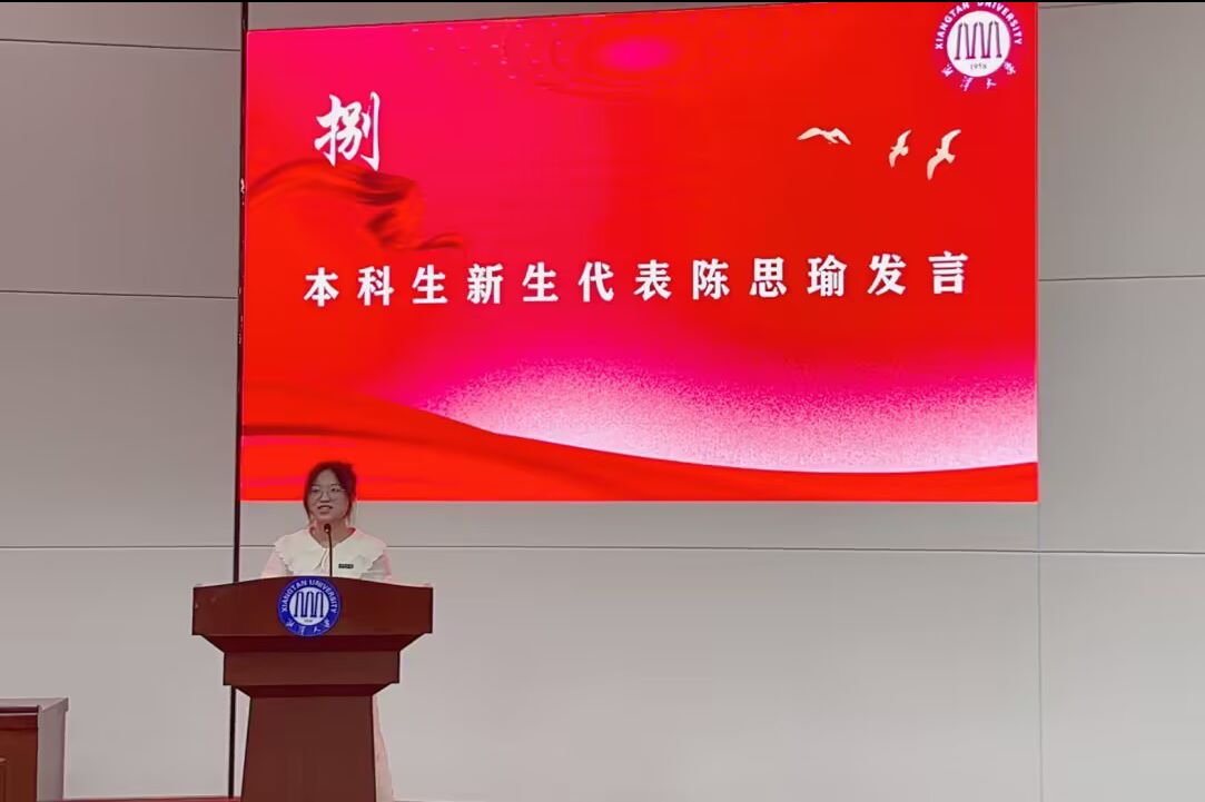 陈思瑜作为本科新生代表发表“成为湘大人”的入学感言,“今天,就让我们郑重地拉开这场人生的新序幕,为四年后想要去到的远方奋力奔跑吧!”倡议全体新生履行“博学笃行,盛德日新”的校训,抓住机会,用刻苦的态度与优异的成绩,以梦为马,一展鸿鹄!