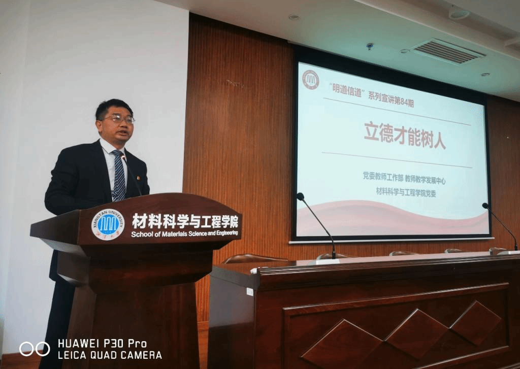 2023年11月14日下午,为进一步推进学院师德师风建设,提高教师队伍整体素质,助力学院高质量发展, yl23455永利官网 在材料大楼A201会议室举行湘潭大学第84期“明道信道”宣讲。学校计划财务处处长刘稳丰以《立德才能树人》为题进行讲座,讲座由材料科学与工程学院党委书记胡义伟主持,学院全体教职工参加。