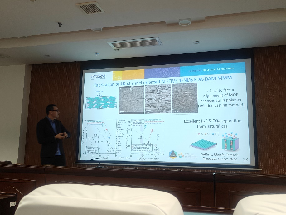 报告中,Guillaume Maurin教授首先介绍了MOFs,作为一种新兴的多孔固体材料,MOFs在多个应用领域中具有选择性地捕获污染物的潜力。Maurin教授强调将MOFs嵌入到聚合物基质中形成的混合基质膜(MMMs),在多种关键气体分离过程中显示出优异性能。他详细阐述了MOF/聚合物界面以及气体通过MMMs的传输机制的重要性。为此,他们选择了一系列MOFs作为填料,结合刚性和柔性聚合物,并使用自主开发的计算策略构建了MOF/聚合物原子模型,并评估了它们的热力学和动力学吸附特性。