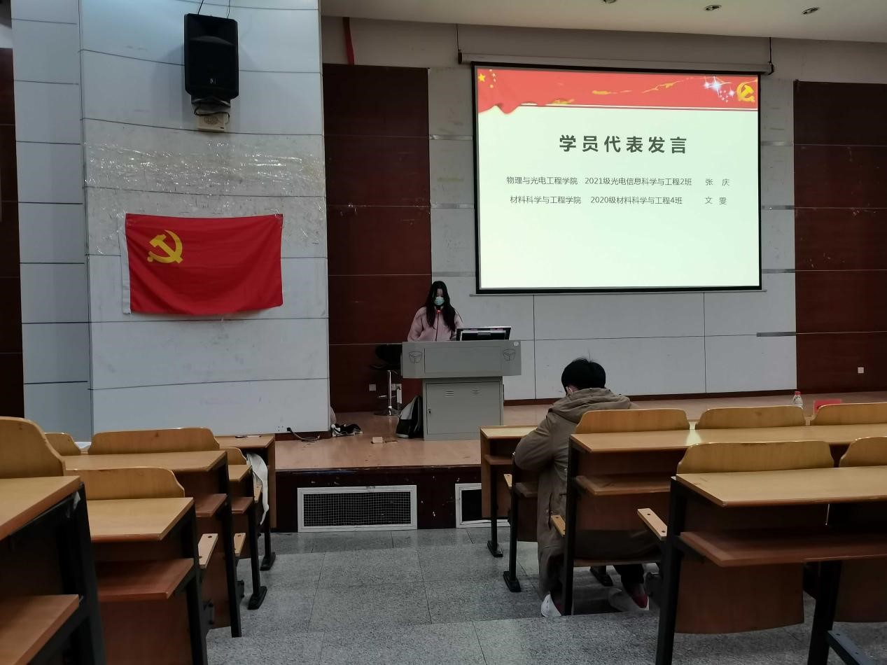 我院学生代表文雯代表全体学员发言,表示将进一步提高对党的认识,深入学习党章党规及党的路线、方针与政策,从思想深处树立坚定跟党走的理想信念,努力肩负起时代给青年的重任。物理与光电工程学院学生代表张庆表示将珍惜难得的学习机会,进一步端正入党动机,认真学习党的基本理论知识,全心全意为同学们服务,在实践中不断完善自我。