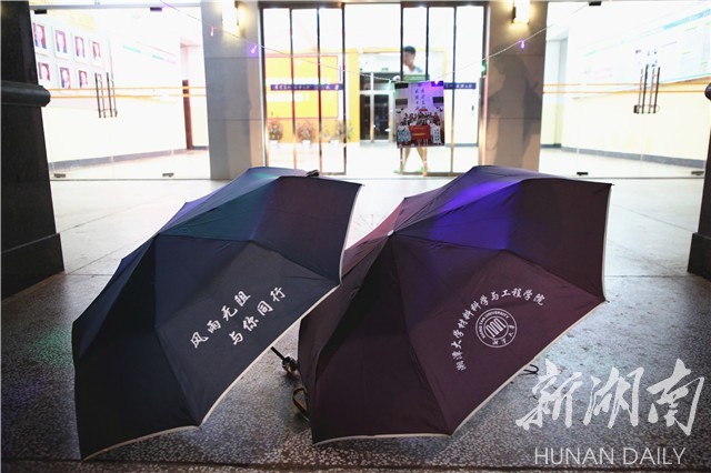 伞面上,一端印着湘大校徽、学院名称,对角端印着“风雨无阻,与你同行”一行字。母校的印记、学院的记忆、师长的祝福全在这一把小小的雨伞上。