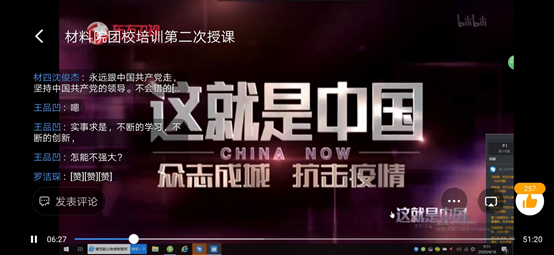 组织部副部长沈俊杰组织第二次授课,带领全体团校学员观看《这就是中国》主题视频。对于视频中所展现的一线抗疫人员无私奉献的感人事迹,中国在疫情中显现出的大国担当,以及全国人民“众志成城、共抗疫情”的决心,同学们在评论里都发表了自己的感想和领悟。