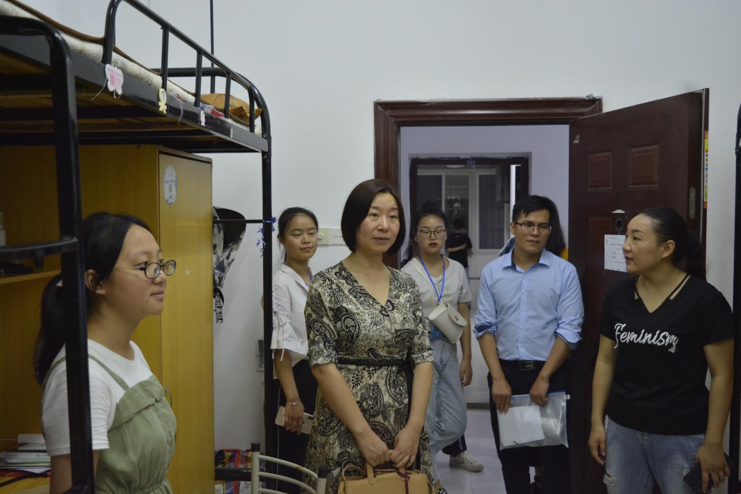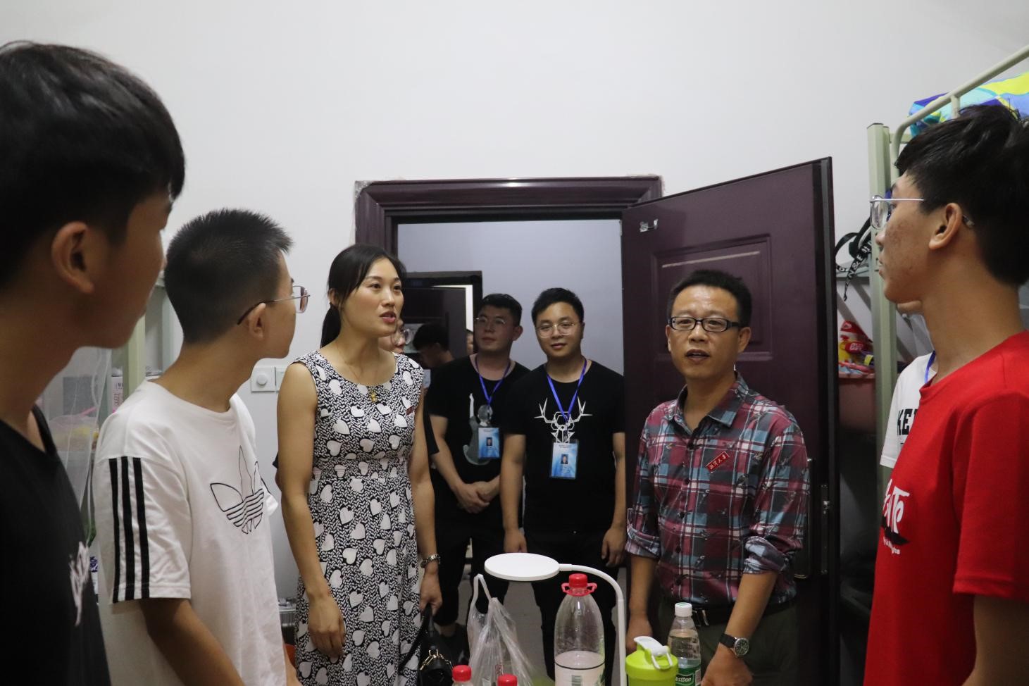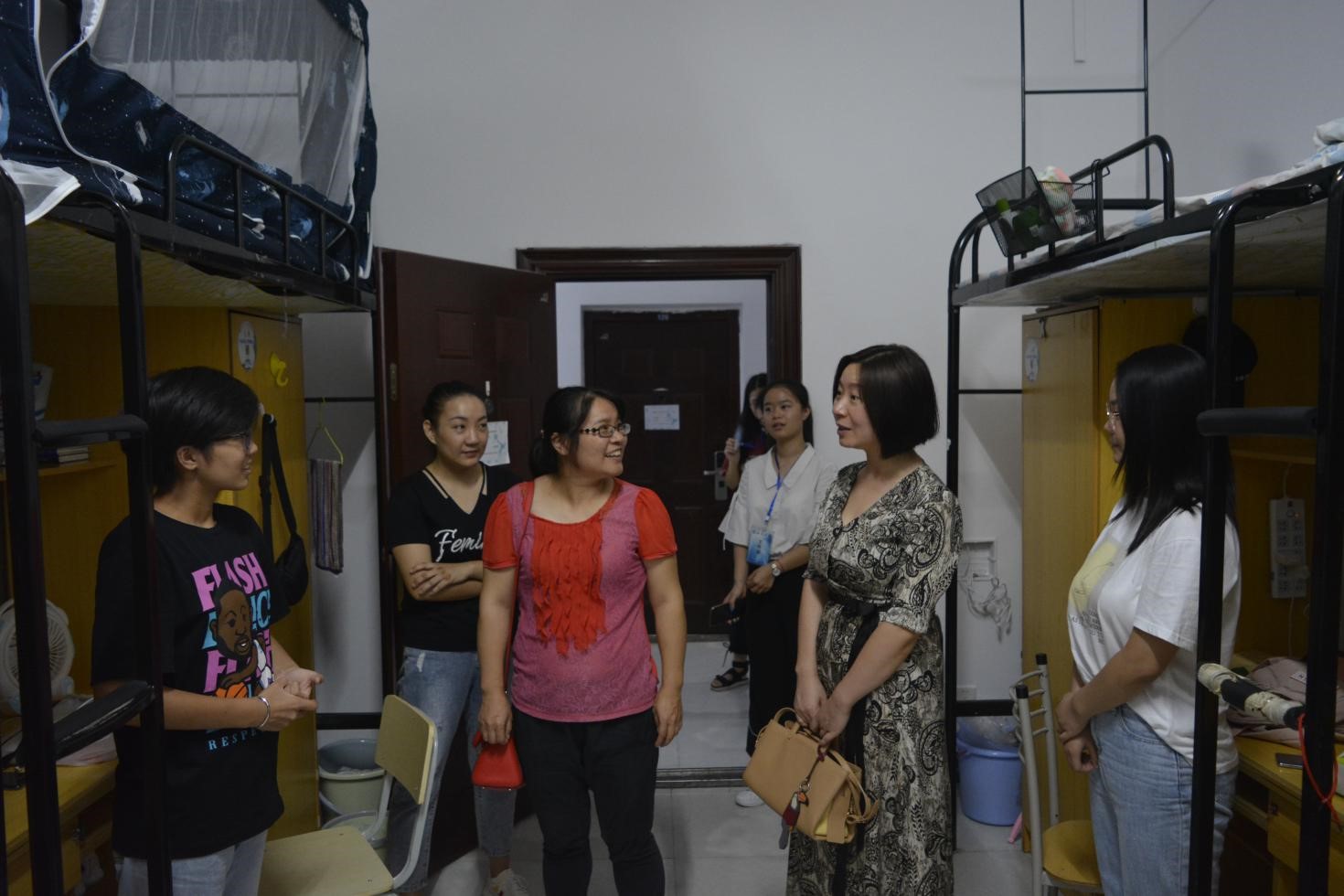 为进一步了解新生入住情况,给初入大学校园的新生送去温暖,8月29日晚,我院党委副书记陈玉莹,党委委员齐福刚、谢淑红、马增胜,团委书记丁小燕以及学工办老师在团委学生会主席团的陪同下前往新生寝室走访看望2019级新生。