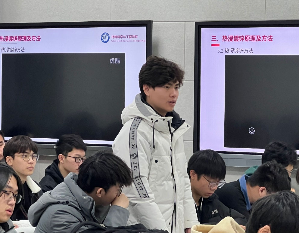 本次课程由材料院李发国副教授主讲。李发国充分借助智慧教学工具,围绕“材料表面工程学——热浸镀锌”这一课程主题,采用翻转课堂、“弹幕”、“在线竞答”等信息化教学手段探索热浸镀锌的原理、方法、运用现状与前景。“要让金属表面镀层均匀牢靠,也不产生漏镀、粗糙、龟裂纹、白锈等缺陷,需要一丝不苟的工匠精神,”他以湘西矮寨大桥钢结构表面防腐等案例讲解热浸镀锌的运用,将专业理论知识与应用实践相结合,让学生在掌握理论知识的同时,也增强了建设伟大祖国的使命感。课堂现场气氛轻松活跃,即使远隔千里,两校同学们也能共同参与其中,在“云端空间”碰撞出思维火花。