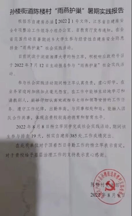 杨立苹表示实践过程中难免需奔波忙碌、加班加点。尽管如此,她仍怀抱虚心学习的态度、发扬吃苦耐劳的精神投身工作,在社会实践中服务大局、回报家乡,贡献青春力量。期间,她参与排查、核实自建房385处,工作成绩突出,受到当地孙楼街道陈楼村党支部的书面表扬。陈楼村党支部对于辛勤工作的杨立苹表示肯定,并对于我校给予基层治理工作的支持表示衷心感谢。