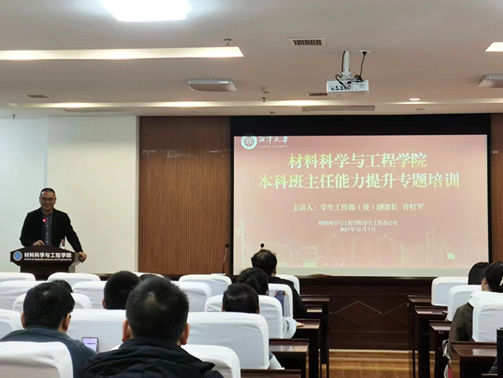 为加强辅导员和班主任队伍建设,提升学生工作管理队伍整体素养和工作实效,切实做好关于学生工作的总体思路:“三个一”的基本工作体系建设,即一个“5+2”整体工作架构、一个“1+2+3+N”学风建设体系以及一个“1+N”服务学生体系。12月7日下午,yl23455永利官网在材料大楼A201开展班主任能力提升培训会。本次培训会由学生工作部(处)副部长许红军主讲。院党委相关负责人出席此次会议,院学工办老师、2020-2023级班主任、兼职辅导员、近两年新进博士以及班主任助理参加此次会议。