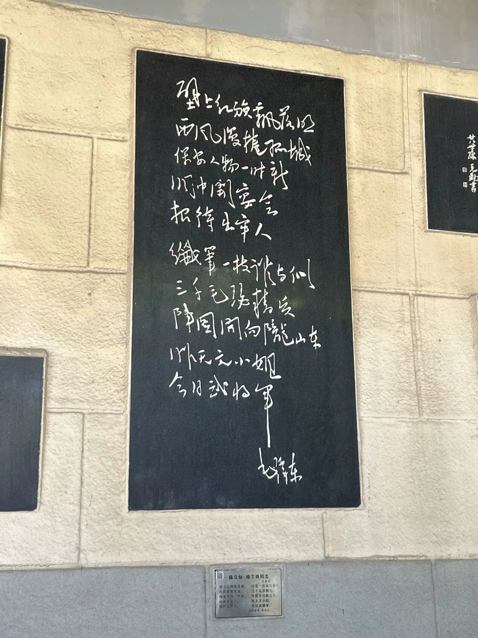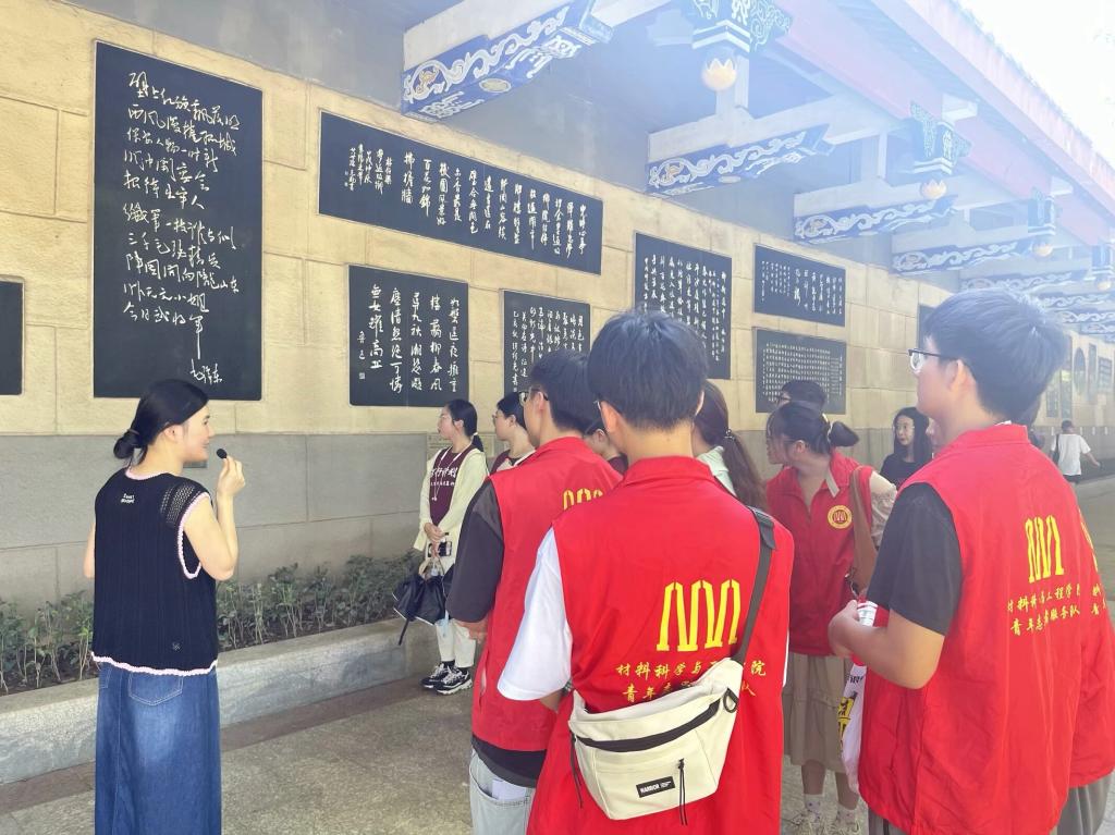 在谭科长的引领下,实践团成员从抗洪纪念碑出发,沿着蜿蜒的诗墙缓缓前行,每一块石刻都仿佛诉说着一段故事,一幅幅精美的诗词书画跃然墙上,让人目不暇接。谭科长详细介绍了诗墙的建设历程,特别是那些为诗墙建设默默奉献的前辈们,他们不辞辛劳,翻阅海量资料,最终从数万首诗作中精选出一千余首,铸就了今日的辉煌。