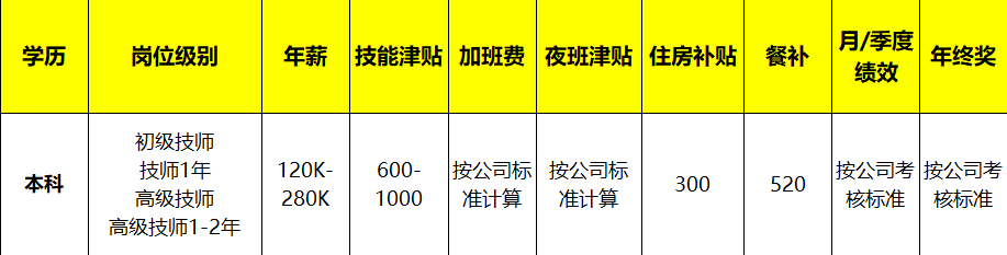 薪资:基本工资+技能津贴+绩效工作+夜班津贴+餐费补贴,平均月收入1W起;
