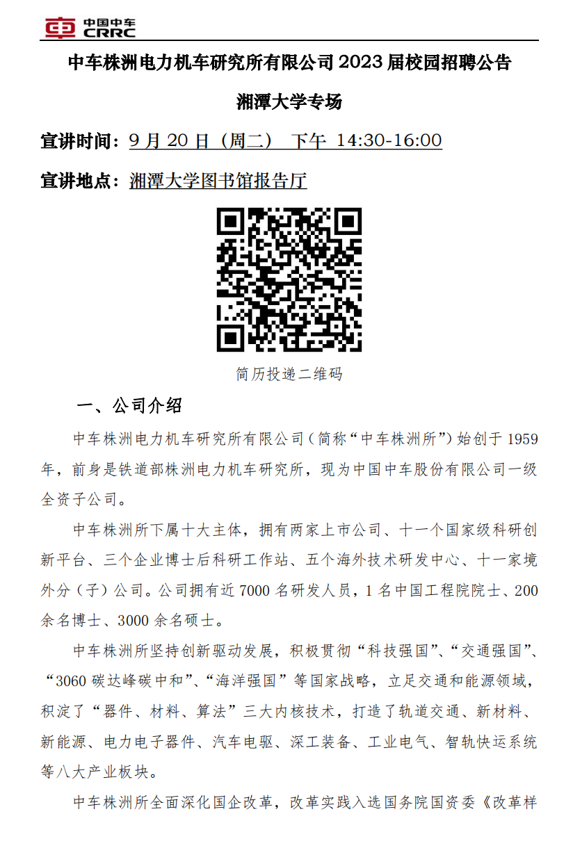 中车株洲电力机车研究所有限公司2023届校园招聘公告