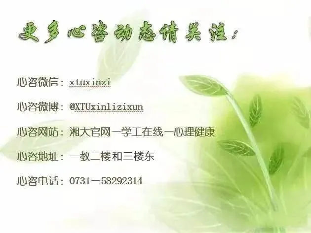 亲爱的同学,你好!欢迎来到湘潭大学心理健康教育与咨询中心!生命是一个不断探索自我、悦纳自我、成为自我的过程,感谢你让我们在生命最深处相遇,陪伴你、见证你的成长!在这里,你可以自主选择咨询师与时间段,让我们一起来看看心咨优秀的咨询师团队吧!