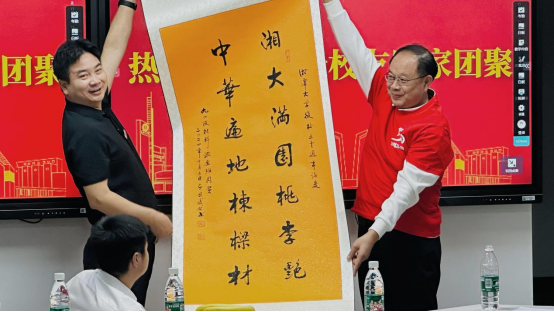 接着,校友代表刘良春向学院献书法作品礼,王金斌执行院长代表学院接受赠礼并为校友回赠纪念礼。
