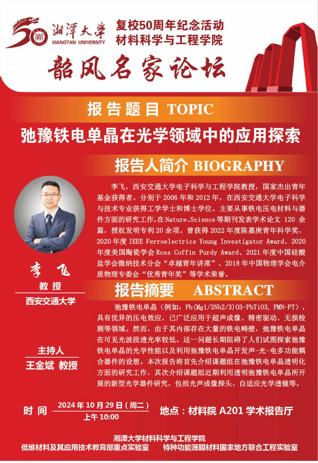 李飞 西安交通大学 教授 2024年10月29日上午10:00 材料院A201学术报告厅 -